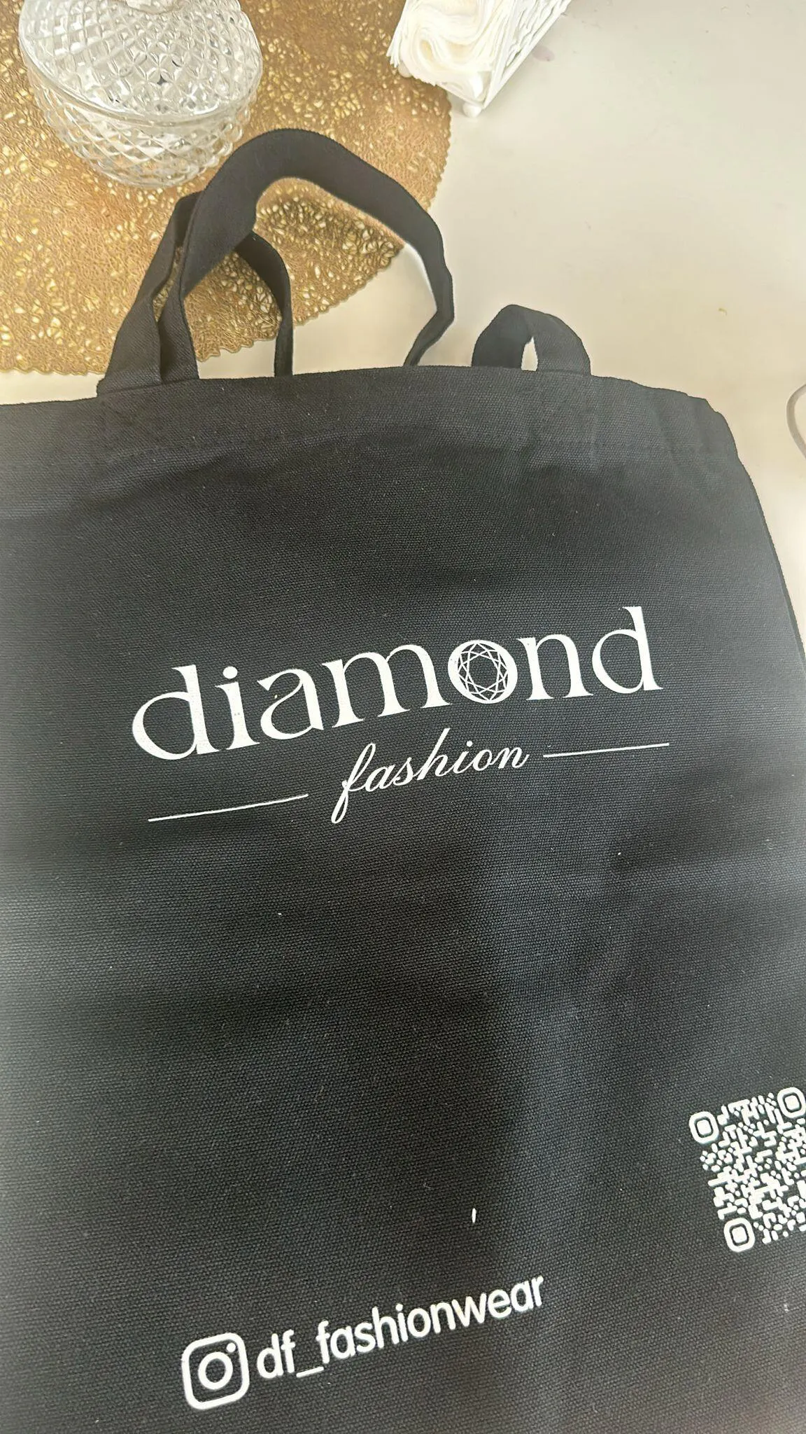 Minimalistinis juodas dizainas su baltu „Diamond Fashion“ logotipu