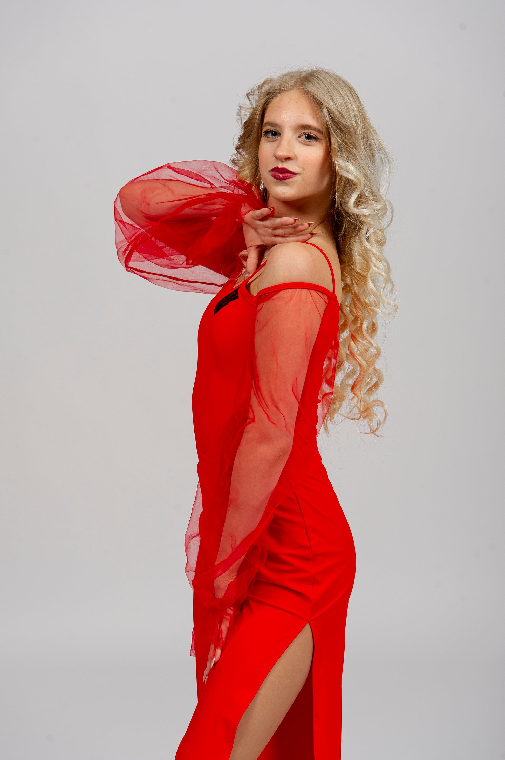 The semi-transparent mesh sleeves with gathered cuffs add dramatic movement, while the off-shoulder necklinehighlights the dancer’s posture and grace.